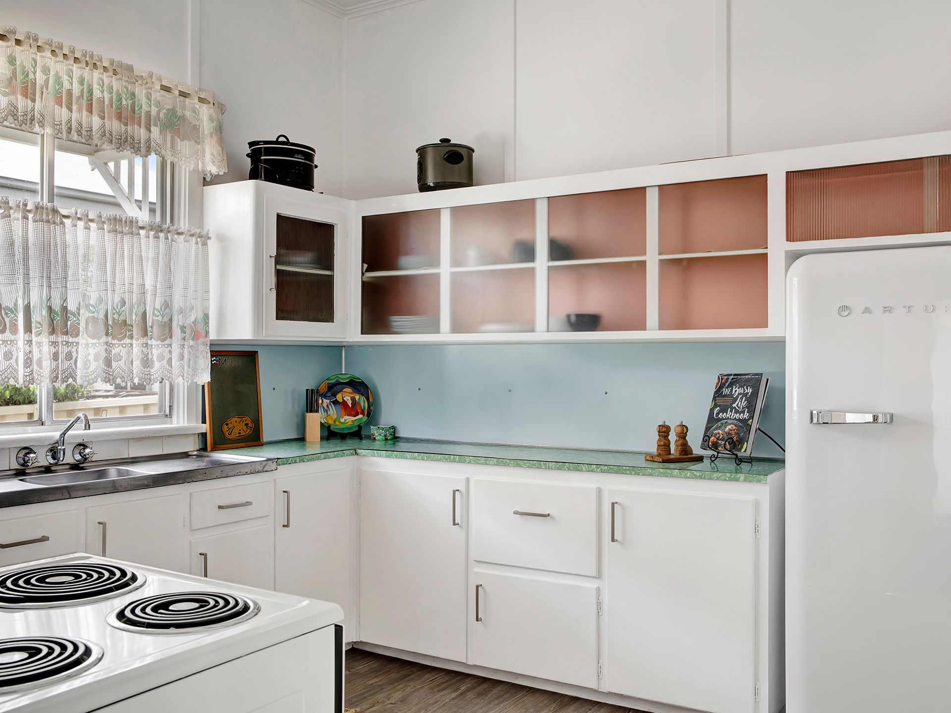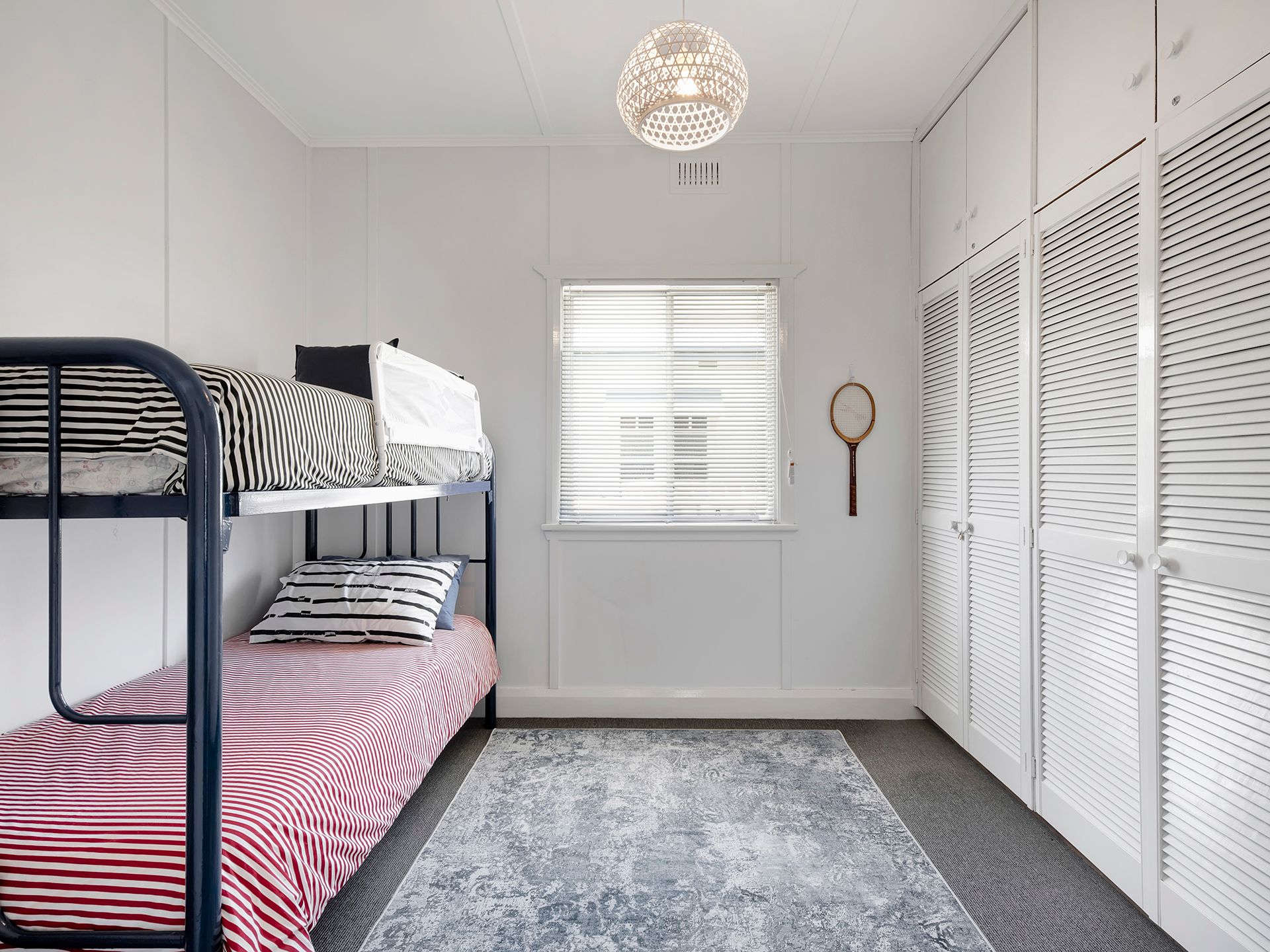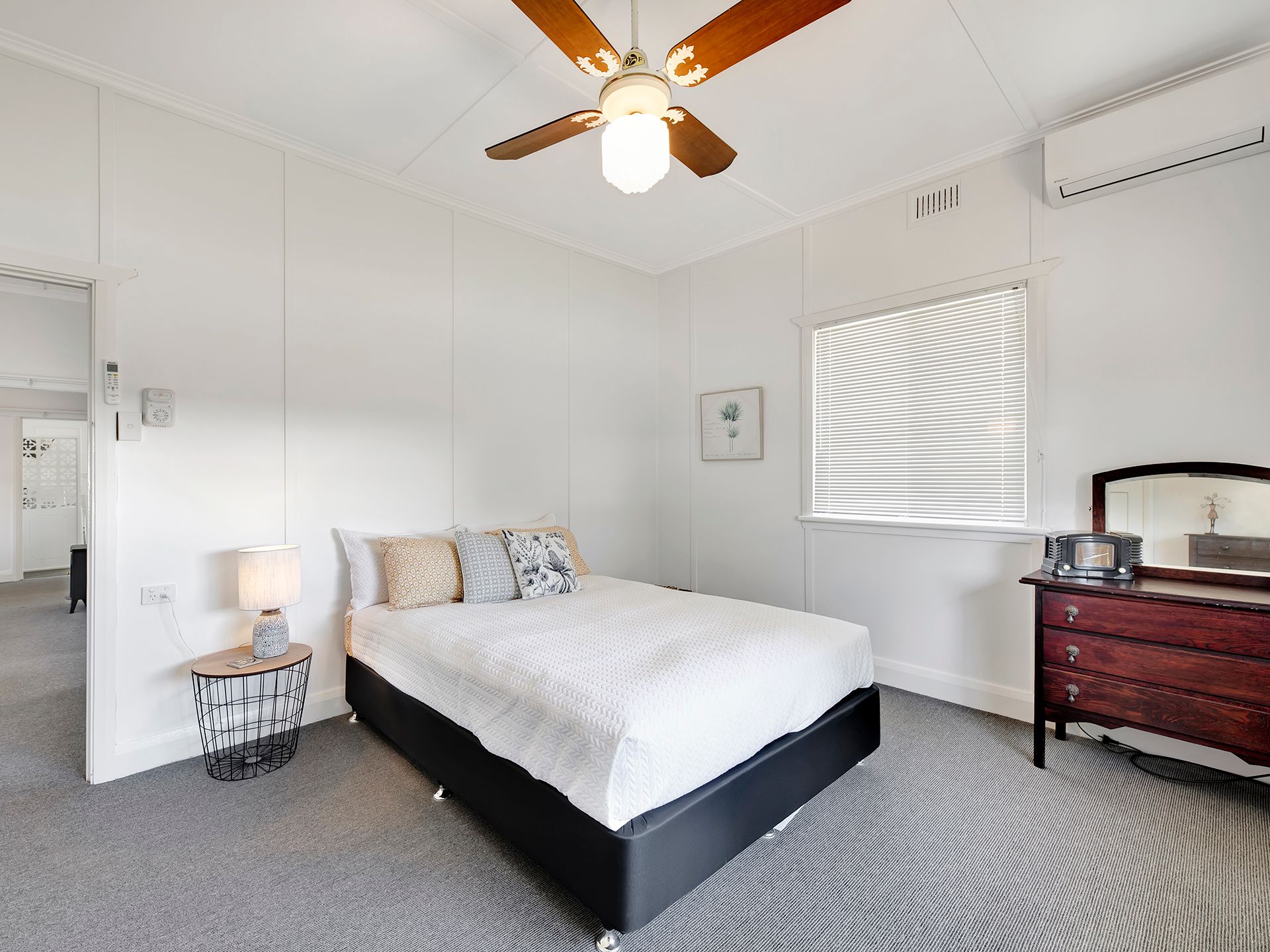 The décor mixes up the decades with a large sized main bedroom offering comfort of a queen-sized bed with air-conditioning facilities. The second bedroom has single bunk beds and all linen is provided. The fully equipped kitchen harks back to the 1950s with upgraded appliances. The cottage offers a good size bathroom with bath and shower/toilet facilities as well as offering another separate toilet. There is also the convenience of a washing machine at the property.