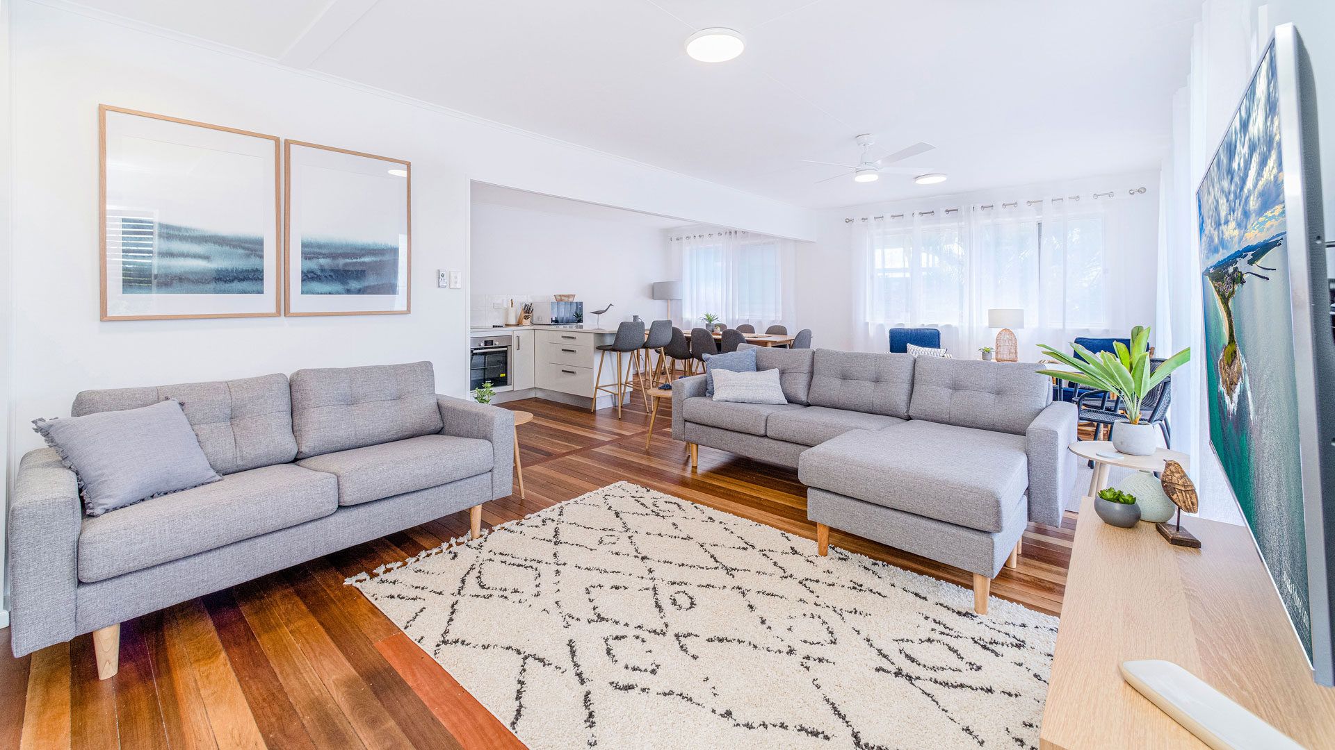 The downstairs level offers additional space to relax, featuring a rumpus room with one queen bed and two single beds, a second bathroom, and a laundry. This versatile area is perfect for two families sharing a holiday or for teenagers seeking their own private retreat.